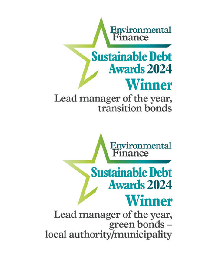 2024年4月、英国の世界的な環境金融専門誌Environmental Financeが発表した「Sustainable Debt Awards 2024」において、「Lead manager of the year, transition bonds」ならびに「Lead manager of the year, green bonds – local authority/municipality」の2部門を受賞しました。