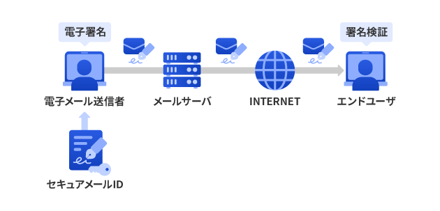 電子メールなどのインターネット上の文書について、送受信するデータの信頼性と、間違いなく本人から送信されたものであることを保証する仕組みです。紙の文書でのサインや印鑑に相当します。